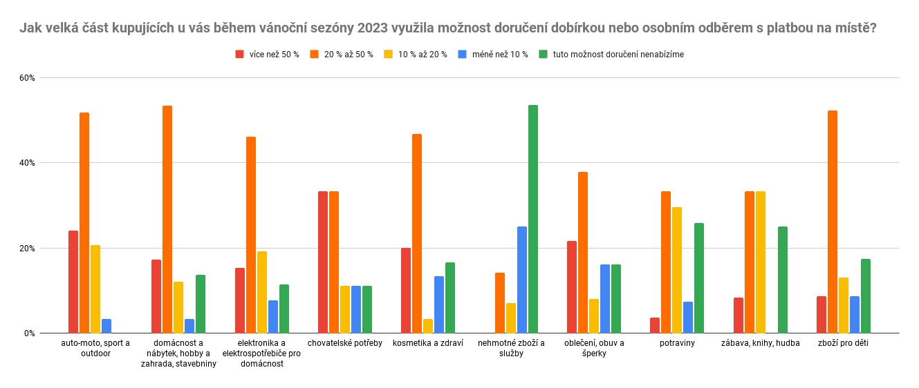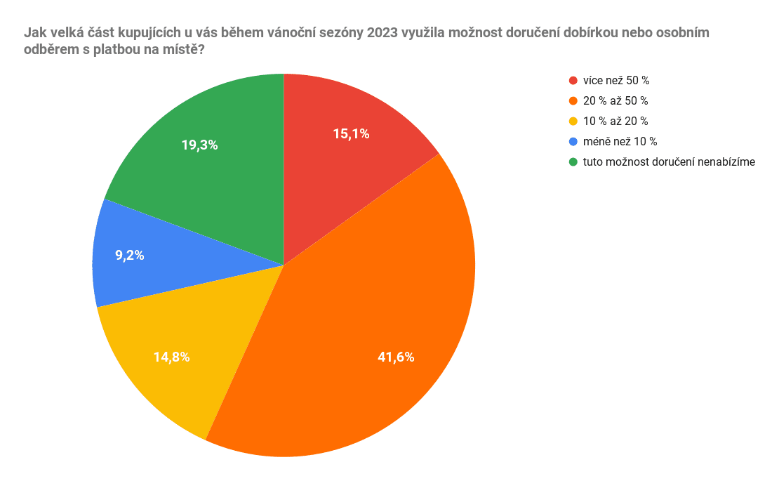 Jak velká část kupujících u vás během vánoční sezóny 2023 využila možnost doručení dobírkou nebo osobním odběrem s platbou na místě?