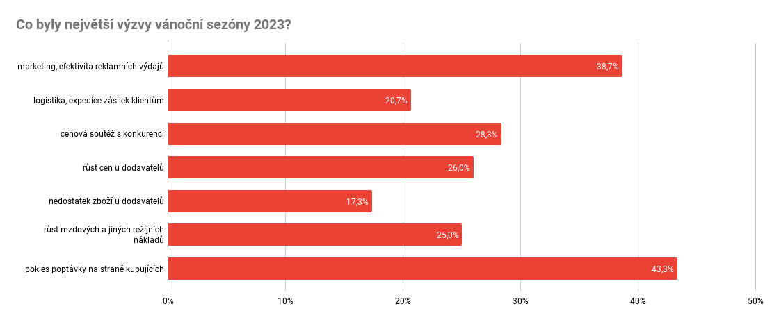 Také odpovědi na otázku týkající se největších výzev vánoční sezóny ukazují na stabilizaci určité části trhu. Zatímco v roce 2022 obchodníky nejvýrazněji trápil růst cen u dodavatelů, během uplynulé vánoční sezóny byl až čtvrtým největším tématem. Naopak, stejně jako před rokem, také tentokrát obchodníky ve velké míře potrápili zákazníci; přesněji řečeno, pokles poptávky. Zdá se, že dodavatelé už těžší ekonomickou situaci překonali, v domácnostech je šetření stále významným tématem.