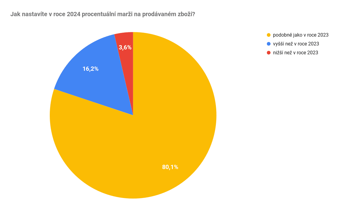 Z poměru odpovědí na plánovanou výši marže vidíme mimo jiné to, jak velká část obchodníků věří, že jim v roce 2024 neporostou náklady, a na druhou stranu také to, že se zákazníci nemohou těšit na dlouhodobé slevy. Čtyři pětiny respondentů věří, že zachová stejnou marži jako v minulém roce, 16 % se chystá na zvýšení. Snižovat hrubý výdělek z prodeje bude jen zanedbatelné množství z účastníků průzkumu.