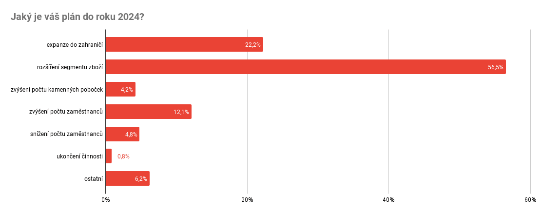 V souladu s minulou odpovědí jdou i plány na rok 2024 – většina obchodníků se chystá na rozšiřování činnosti. Nejčastěji plánují rozkročení do dalších segmentů, případně obohacování sortimentu prodávaného zboží. Téměř čtvrtina respondentů pokukuje za hranice a chystá expanzi, dvanáct procent jich bude zvyšovat počet zaměstnanců. Samozřejmě se vyskytují i pesimističtější plány: v kolonce „ostatní“ se skrývá několik lakonických odpovědí obchodníků, kteří plánují pouze přežít. Jde však o nižší jednotky procent.