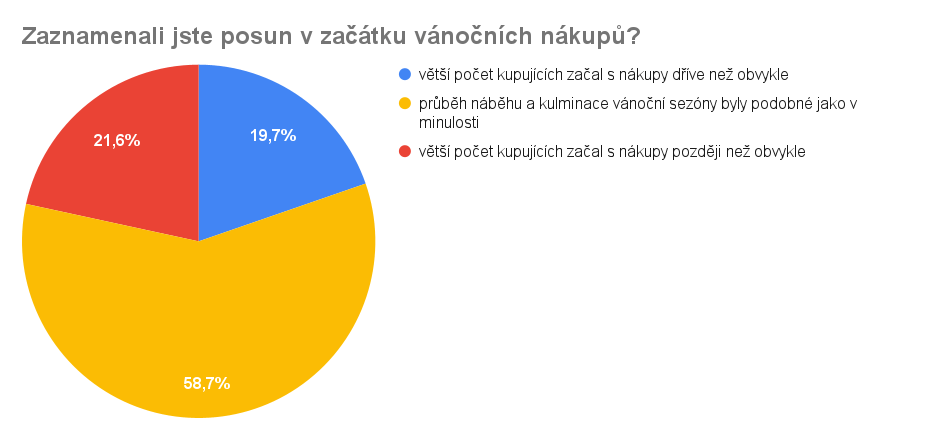 Další část průzkumu se zaměřila na časový průběh vánoční sezóny. Ta podle některých ukazatelů začala později než v minulosti, zákazníci s většími nákupy před koncem roku otáleli. Respondenti průzkumu tento trend nezaznamenali, v menší míře se v segmentovém rozdělení projevil pouze u čtyř druhů zboží.