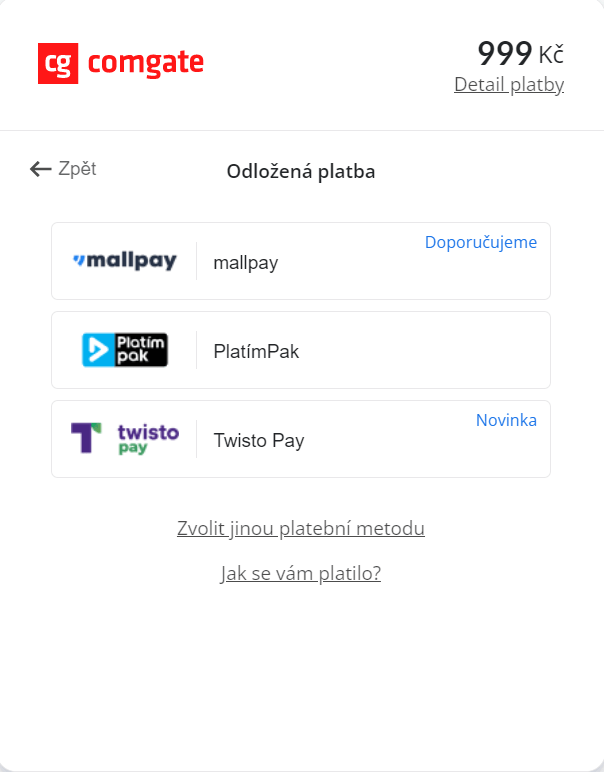 Ano, zní to překvapivě, ale pokud Váš zákazník zvolí jako platební metodu na platební bráně jednu z odložených plateb, Váš náklad na transakci bude nižší než v případě platby kartou nebo bankovním převodem. Sazby jsou odstupňovány podle objemů transakcí.