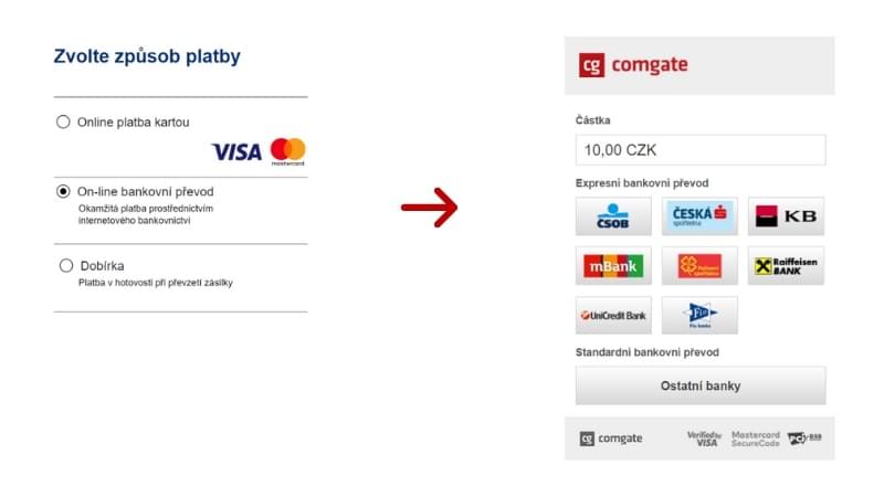 V tuzemsku využijete platbu zrýchleným bankovým prevodom pre Česku sporitelnu, ČSOB, Komerční banky, Raiffeisen Bank, UniCredit Bank, Poštová sporiteľne, mBank a Fio banky.