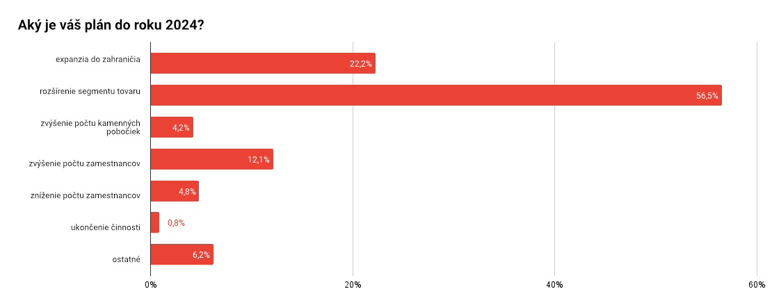 V súlade s minulou odpoveďou idú aj plány na rok 2024 – väčšina obchodníkov sa chystá na rozširovanie činnosti. Najčastejšie plánujú rozšírenie do ďalších segmentov, prípadne obohacovanie sortimentu predávaného tovaru. Takmer štvrtina respondentov pokukuje za hranice a chystá expanziu, dvanásť percent obchodníkov bude zvyšovať počet zamestnancov. Samozrejme sa vyskytujú aj pesimistickejšie plány: v kolonke „ostatné“ sa skrýva niekoľko lakonických odpovedí obchodníkov, ktorí plánujú len prežiť. Ide však o nižšie jednotky percent.