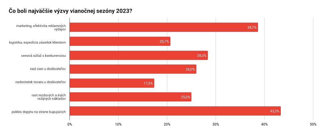 Aj odpovede na otázky týkajúce sa najväčších výziev vianočnej sezóny ukazujú na stabilizáciu určitej časti trhu. Zatiaľ čo v roku 2022 obchodníkov najvýraznejšie trápil rast cien u dodávateľov, počas uplynulej vianočnej sezóny bol až štvrtou najväčšou témou. Naopak, rovnako ako pred rokom, aj tentokrát obchodníkov vo veľkej miere potrápili zákazníci; presnejšie povedané, pokles dopytu. Zdá sa, že dodávatelia už ťažšiu ekonomickú situáciu prekonali, v domácnostiach je šetrenie stále významnou témou.